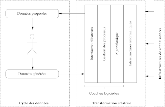 La transformation créatrice proprement dite est constituée de plusieurs couches. Une couche matérielle correspondant aux infrastructures informatiques (telles les fameuses fermes de calcul) est utilisée par différentes couches logicielles. C’est dans ces dernières que s’opère la transformation créatrice.