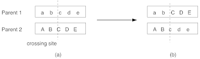 The role of a crossover operator is to create new chromosomes in the population by using characteristics of parent chromosomes. If the crossover operator copies interesting characteristics, the corresponding new chromosomes should enjoy a better potential of adaptation, i.e. their fitness values should increase. The basic idea is that information, known as genes, is exchanged between two selected chromosomes to create two new chromosomes. An example of such an exchange is shown in Figure 4. A position called the crossing site is selected randomly from the string. The new chromosomes are constructed by mixing the left- and the right-hand sides of each parent’s crossing site.