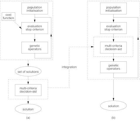 Most of the approaches merging multiple objective optimization and GA are illustrated in Figure 7 a: GA compute a set of Pareto solutions and a multi-criteria decision-aid method is then used to choose the best one as the final solution. Because most Pareto-based methods focus on a single point on the Paretofront, some potentially interesting solutions fail to be studied.