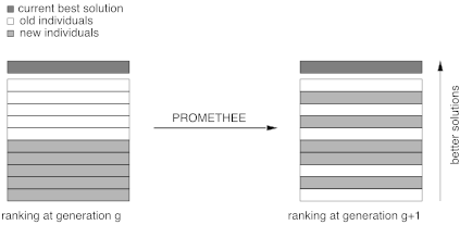 To tackle grouping problems with multiple objective optimization Brahim Rekiek proposed an extension of the GA that uses a multi-criteria decision-aid method for ranking (Figure 7) [5] . The important feature is the integration because it enables the GA to scan all the interesting parts of the search space. Because the method is called upon each time an evaluation of a population is needed, it is important for the method to be rapid. The PROMETHEE method [6] is the multi-criteria decision-aid used.