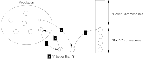 An initial set of all the individual identifiers is established. Two identifiers of this set are chosen randomly (step 1), and their fitness values are compared (step 2). The best of the two — the one corresponding to the individual with the best fitness value — is reinserted into the set, while the other is pushed into the list (step 3). This method is repeated until all the identifiers in the set are in the list; this process leads to the construction of an ordered list of individuals, with the best one at the top of the list. The operator can then presume that the chromosomes ranked in the top half will be used as parents for the crossovers and the resulting children will replace the chromosomes in the bottom half.