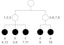 \[\begin{array}{l} a=\{1,2,3,4,12\}\\ b=\{1,2,3,5,6\}\\ c=\{1,2,3,7,11\}\\ d=\{5,6,7,8,9\}\\ e=\{5,6,7,8,10\} \end{array}\]