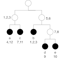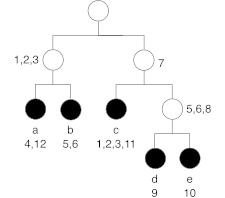 But, regarding the attributes assigned to the non-leaf nodes, it is clear that \(T_2\) and \(T_3\) are not identical. Intuitively, we may consider that the sub-tree formed by \(d\), \(e\) and their parent node is more similar between \(T_1\) and \(T_2\) than between \(T_1\) and \(T_3\). In fact, in \(T_2\) this sub-tree shares one attribute (\(7\)) with another object (\(c\)); and in \(T_3\), it shares two attributes (\(5\) and \(6\)) with another object (\(b\)), while in \(T_1\) it shares no attributes at all.