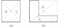 When the instance defines terminals, every object involved must have at least one terminal with one connector. By default, when an object defines no terminals, an imaginary one is created at a “central” position \(C\) of the corresponding object. When the object is a rectangle, the “central” position \(C\) is the mass point \(G\) of the rectangle (Figure 3a), else the “central” position \(C\) corresponds to the nearest vertex to the mass point \(G\) of the bounding rectangle (Figure 3b).