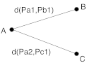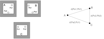 An example of the correspondence is shown at Figure 8. Suppose we have three objects with a single terminal, each terminal has two possible positions. To construct the graph which corresponds to the net involving the terminals \(A\), \(B\) and \(C\), we create a vertex for each terminal and an edge between all these vertices. The weight of a given edge, for example between the vertices \(A\) et \(B\), is the minimum distance of all possible distances between the positions of these two terminals, in this example, it is the distance between the positions \(P_{a1}\) and \(P_{b1}\).