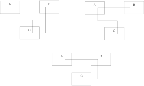 When a net links more than two objects, it does not mean that all terminals involved have to be connected together directly. This means that there are different orientations possible for a single net. The Figure 5 shows the different configuration for a net between three objects. Of course, the number of possibilities increases when some terminals may have multiple connectors.