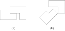 The limitation to these orientations is justified by the fact that the union of a given set of rectangular polygons with one of these orientations is also a rectangular polygon (Figure 2a), which makes it easy to consider it as an object itself. In comparison, the union of two rectangular polygons where one of them was obtained by a 45° rotation (Figure 2b) is not a rectangular polygon.