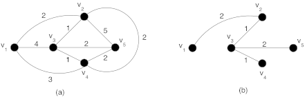Figure 7. An edge-weighted undirected graph (a) and its minimum spanning tree (b).