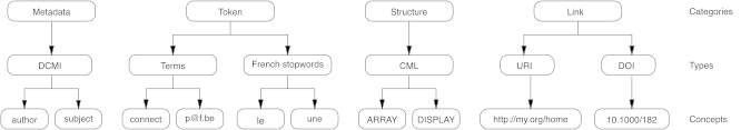 Each concept, \(c_i\), has a given concept type, \(\tau_{i}\). A concept type identifies concepts that share a same “worldview”, for example metadata from the Dublin Core Metadata [5], tags and attributes from a same XML schema, French or English stopwords, an identical interpretation of character strings (such as URI ou DOI), etc. Each concept type acts as a namespace for the corresponding concepts, i.e. the character string representation of a concept must be unique in a given concept type. Moreover, we suppose that each concept type defines one neutral concept, “*”, that represents any set of concepts of that type.
